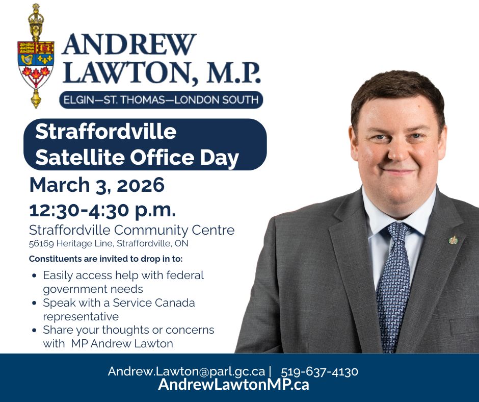 Member of Parliament, Andrew Lawton, is hosting a Satellite Office Day at the Straffordville Community Centre in the Trackless Lounge on March 3rd from 12:30 - 4:30 PM to provide constituents on the east side of our riding, easier access to the many services his office offers. A representative from Service Canada will also be present. Come out to get help with your federal government issues or simply drop in to meet your new Member of Parliament in person. Please see flyer for more information.